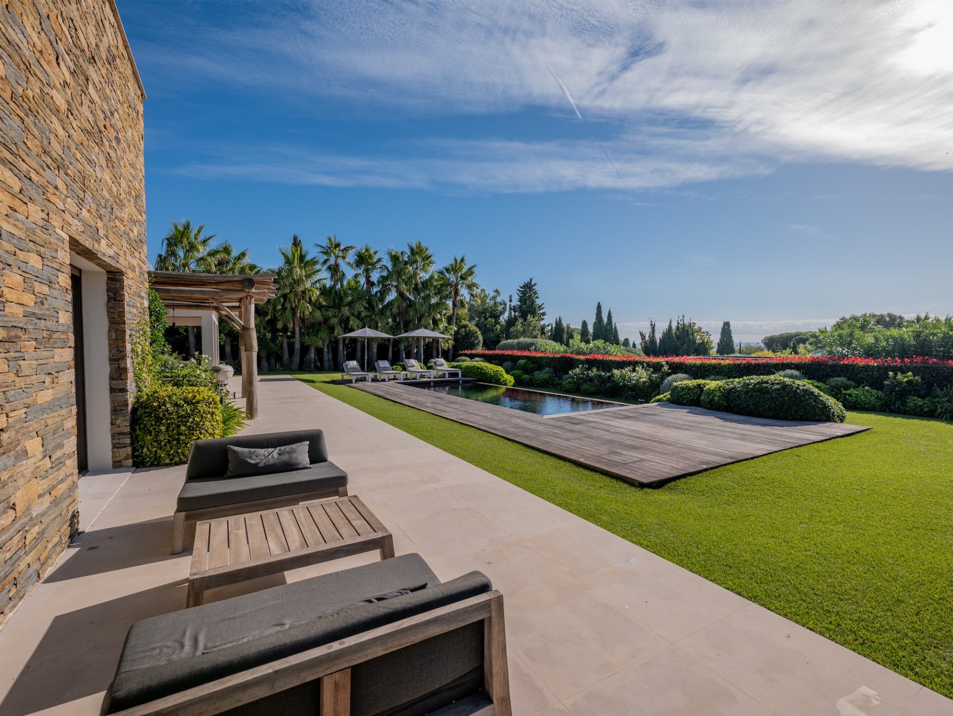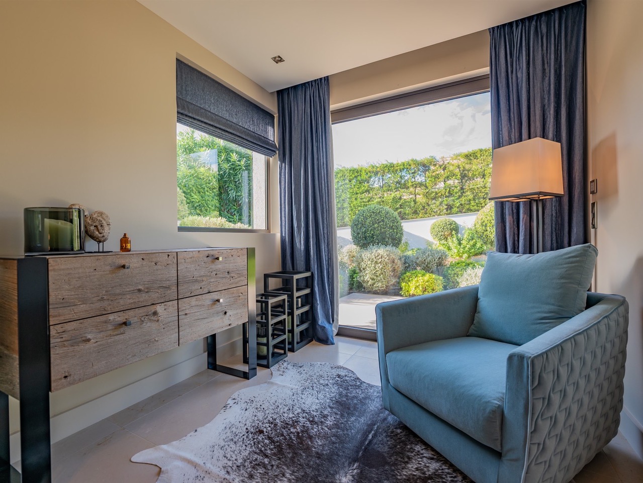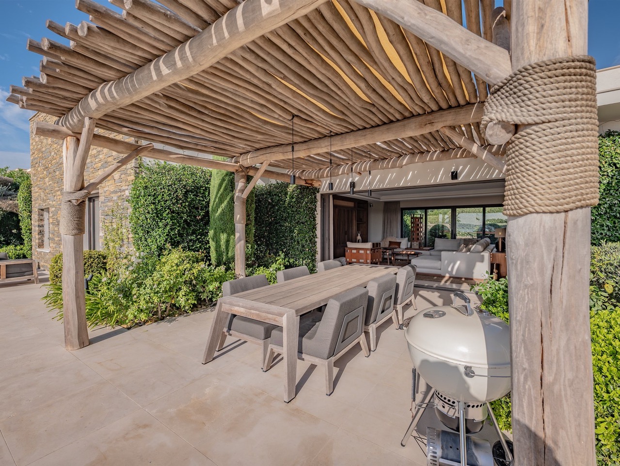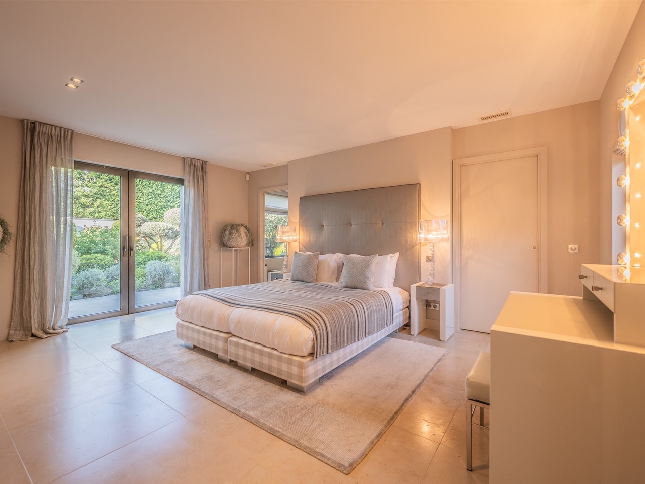 Buiten wacht een waar paradijs: grote terrassen, een verwarmd zwembad en een zorgvuldig aangelegde weelderige mediterrane tuin die als een groene oase om de villa heen ligt. Een sfeervolle patio met fontein completeert het geheel. Dit prachtige vlakke perceel maakt het buitenleven hier ongekend comfortabel.