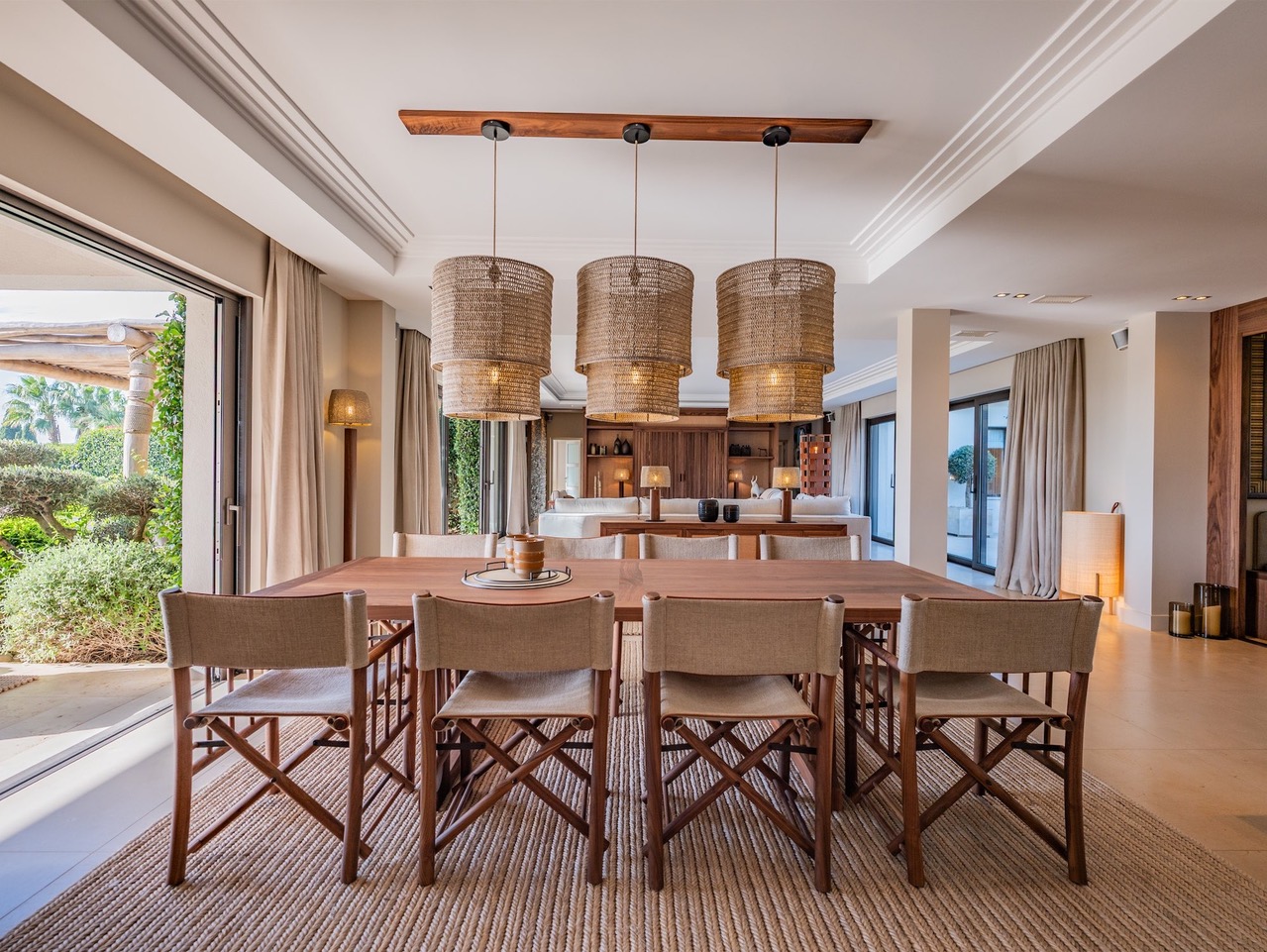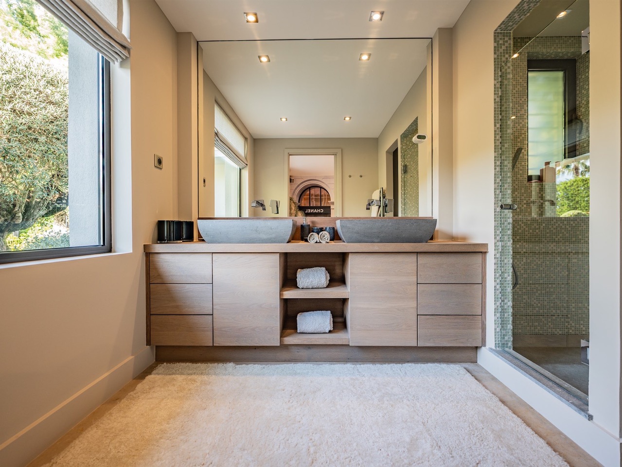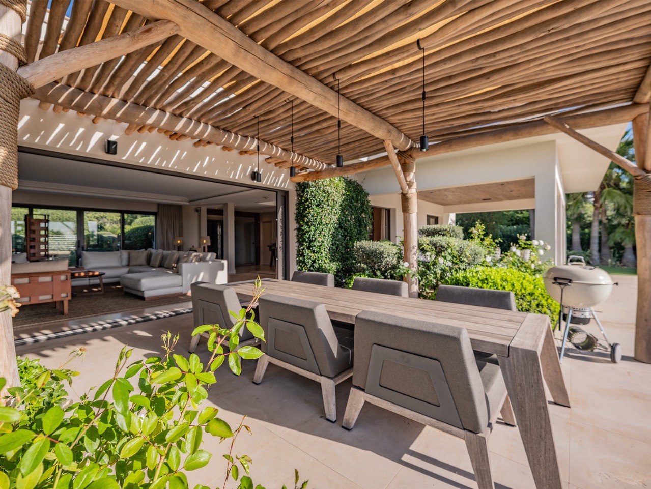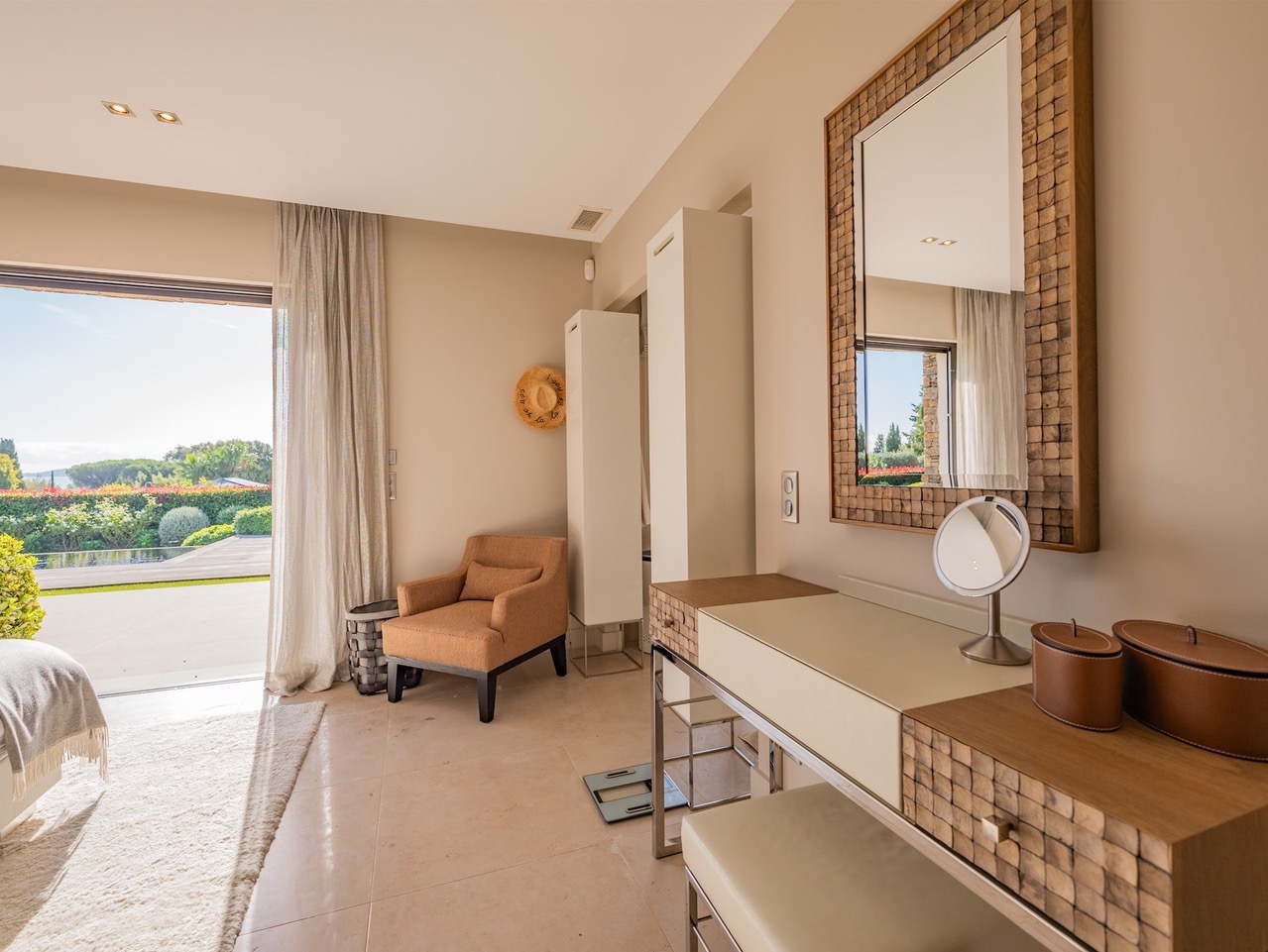 Buiten wacht een waar paradijs: grote terrassen, een verwarmd zwembad en een zorgvuldig aangelegde weelderige mediterrane tuin die als een groene oase om de villa heen ligt. Een sfeervolle patio met fontein completeert het geheel. Dit prachtige vlakke perceel maakt het buitenleven hier ongekend comfortabel.