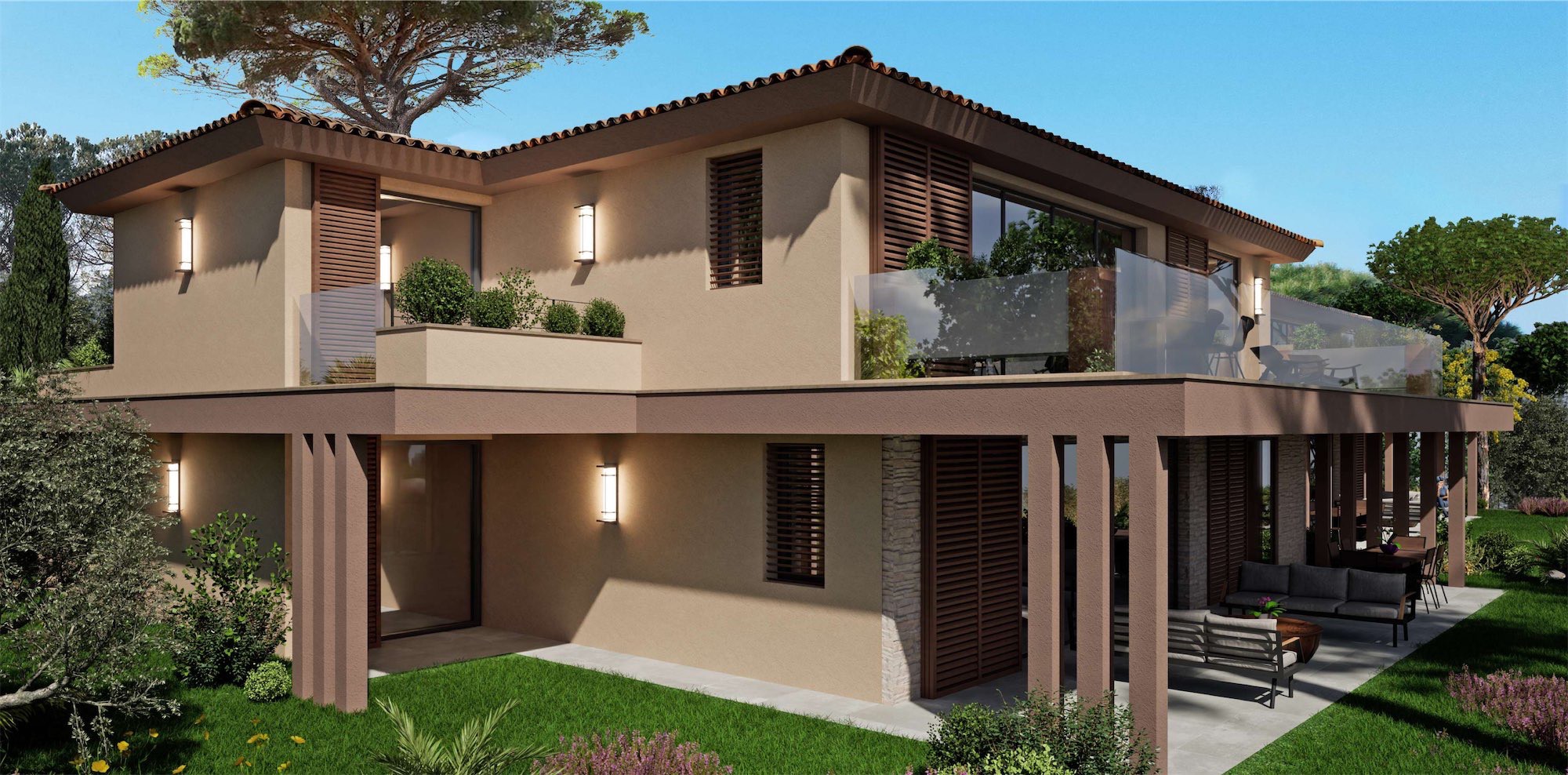 De residentie is ontworpen met respect voor de authentieke stijl van de streek, waarbij moderne lijnen worden gecombineerd met traditionele materialen. De gevels zijn bekleed met natuursteen uit Bormes, terwijl de daken zijn afgewerkt met verouderde ronde dakpannen in een warme, roségouden tint. Dit zorgt voor een tijdloze uitstraling die naadloos opgaat in het mediterrane landschap.
