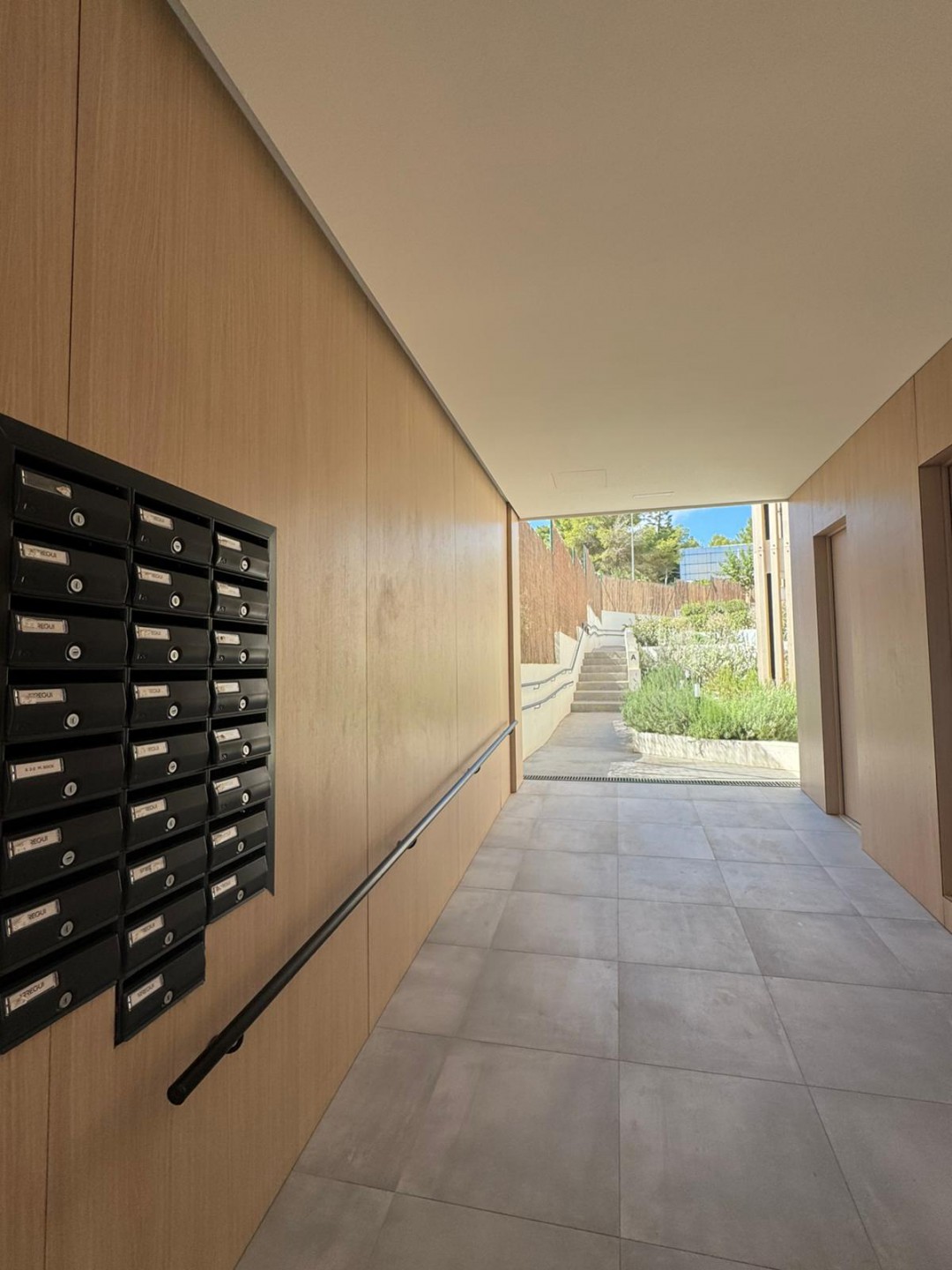 Het appartement bevindt zich op de bovenste verdieping van een modern gebouw met lift en gemeenschappelijk zwembad. Binnen geniet je van een lichte, ruime indeling met twee slaapkamers en twee moderne badkamers. De open leefruimte komt uit op een royaal terras van 19 m², waar je kunt ontspannen in de zon en genieten van het vrije uitzicht.